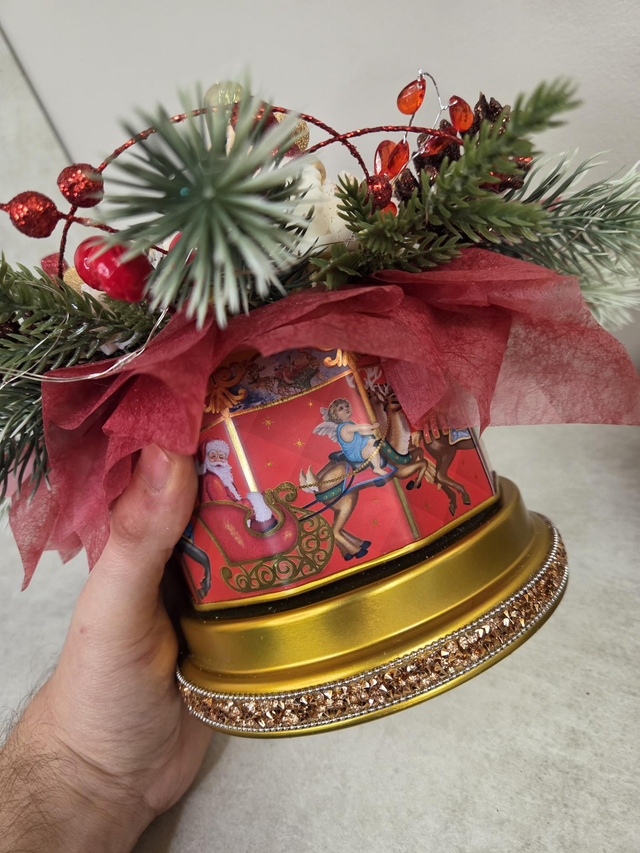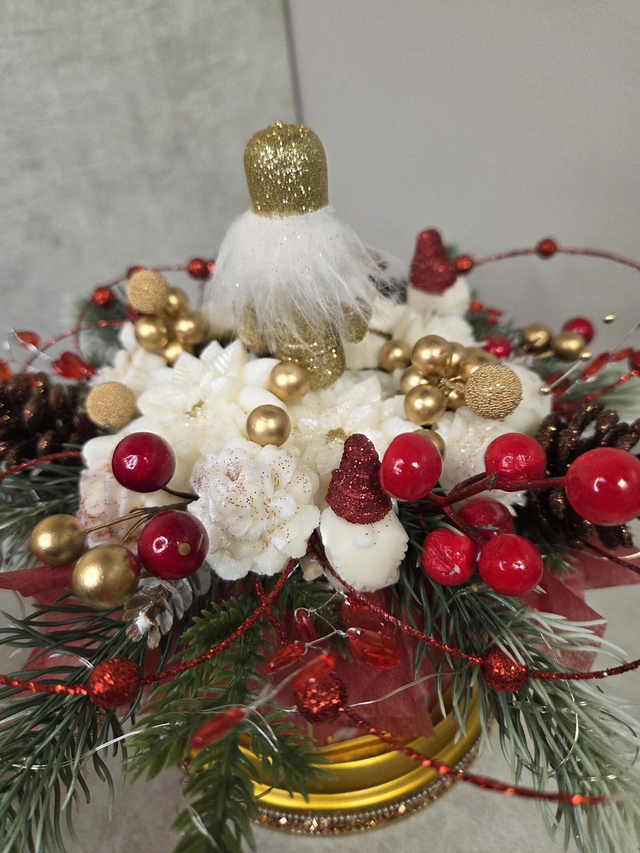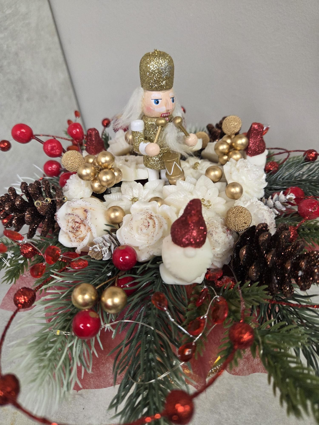 Un charmant casse-noisette tourne au rythme d’une douce mélodie, accompagné d’un bouquet de Noël en cire parfum fraises des bois.
