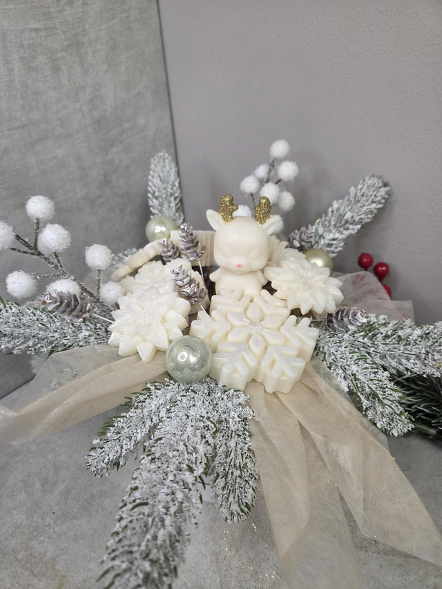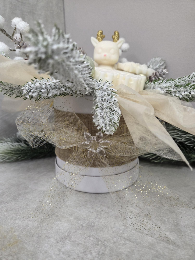 • Contenant : Seau blanc avec nœud scintillant, Petit renne en cire blanche aux bois dorés, flocons de neige, branches et pommes de pin givrées.