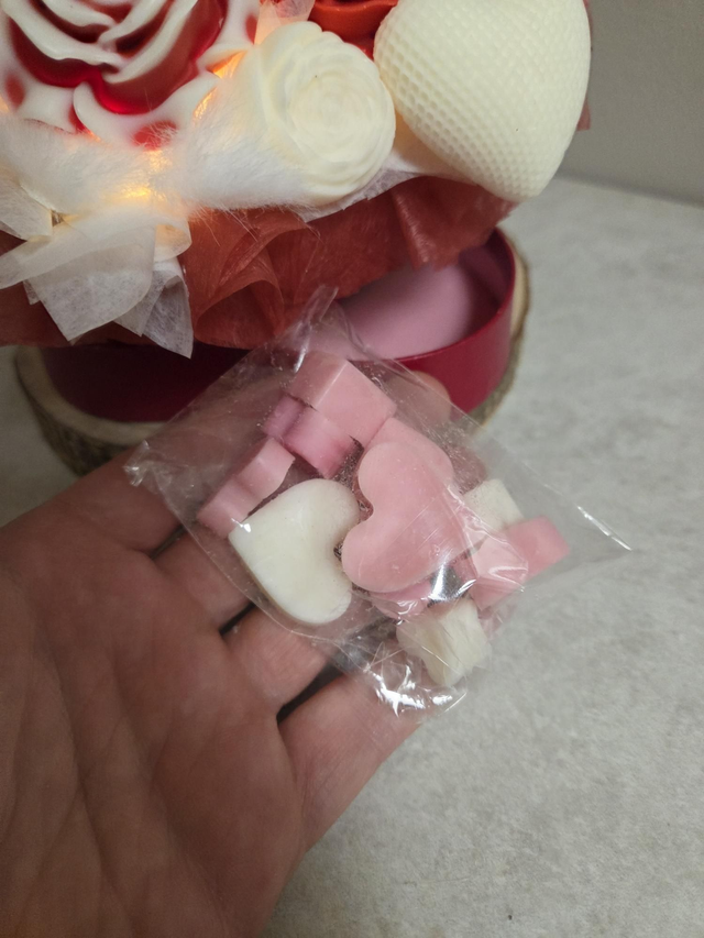 Le bouquet est présenté dans une boîte en forme de cœur, qui cache de petits fondants parfumés à la fraise en forme de cœur. Ces fondants peuvent être utilisés séparément dans un brûle-parfum, sans abîmer le bouquet principal, afin de prolonger le plaisir olfactif.