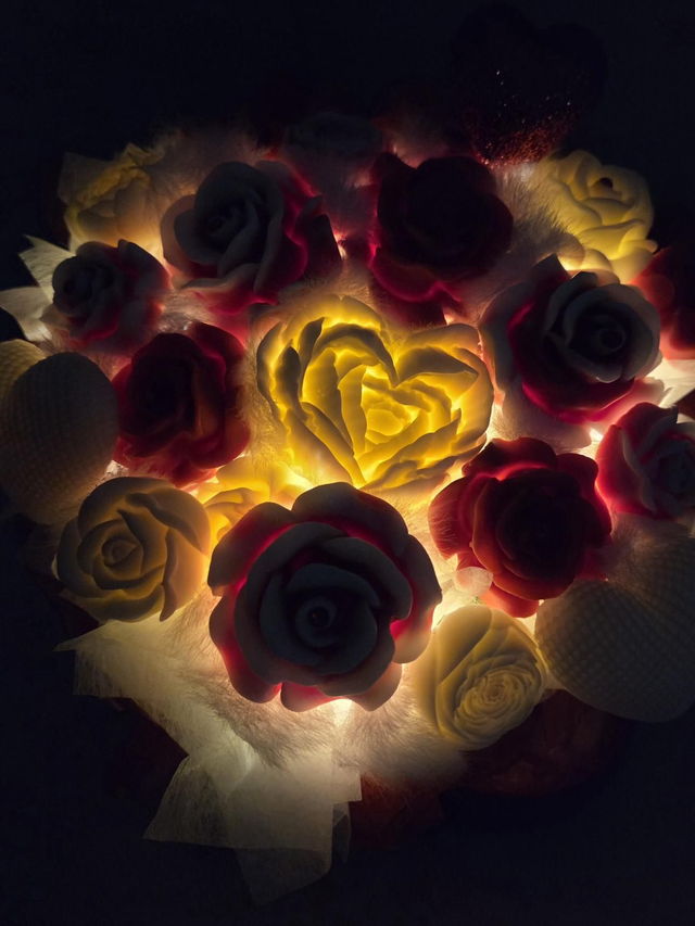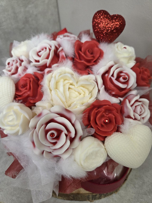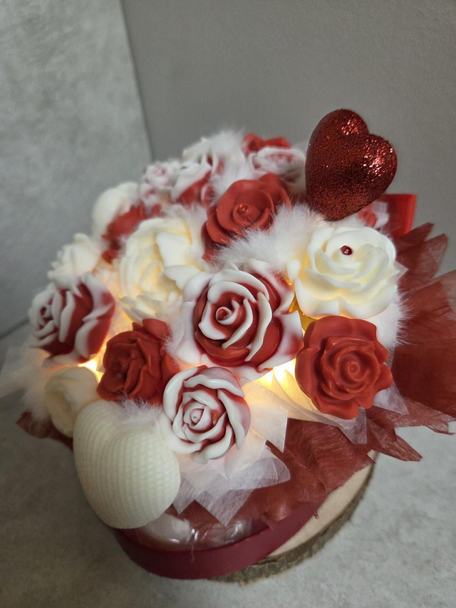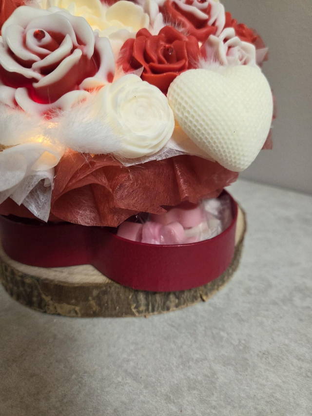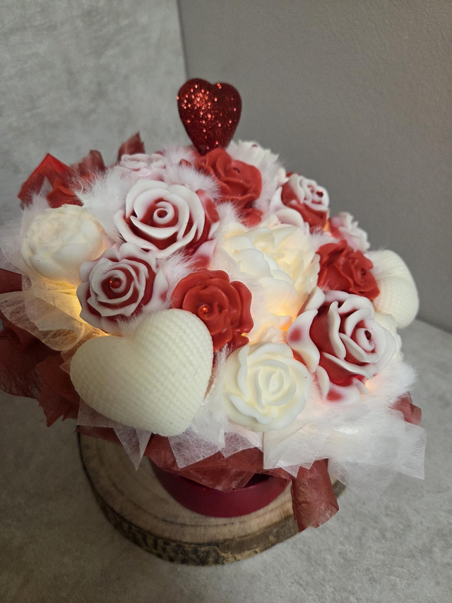 Composé de roses en cire aux teintes rouges et blanches, ce bouquet est délicatement illuminé par une petite guirlande électrique, diffusant une lumière douce et chaleureuse. Un adorable cœur pailleté trône au sommet, apportant une touche scintillante et romantique à l’ensemble.