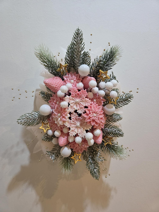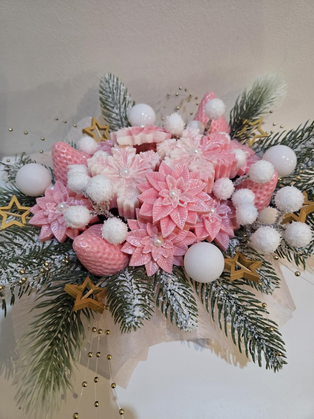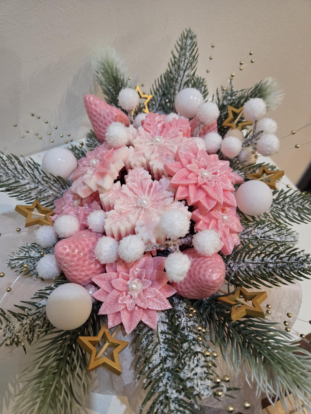 Élégante composition de cire faite main décorée de fleurs de Noël en rose et blanc. Son parfum chaleureux de fraise des bois diffuse une note douce et fruitée, parfaite pour les fêtes.