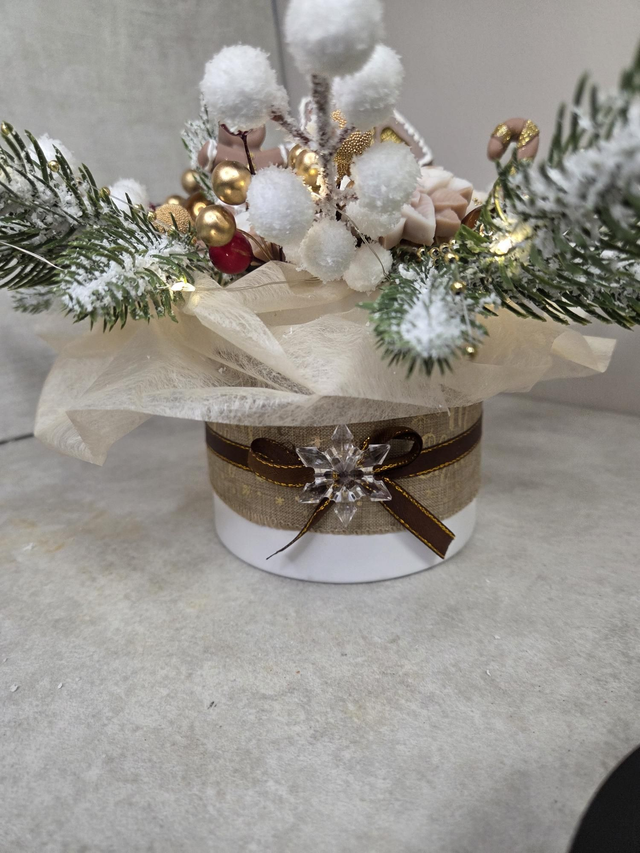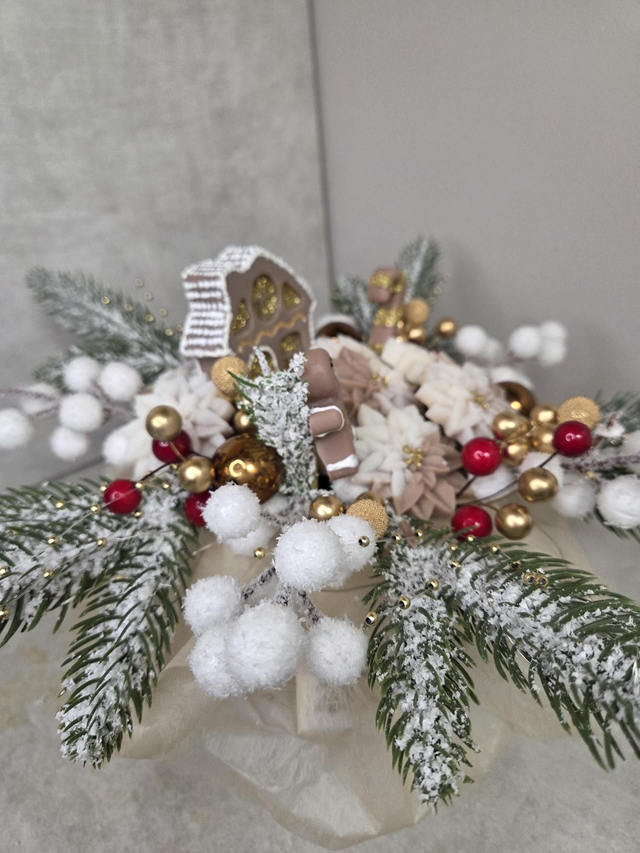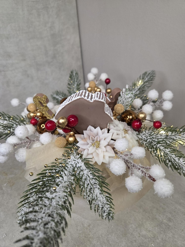 • Contenant : Seau blanc avec nœud bonhomme et maison peine épice fleurs de Noël