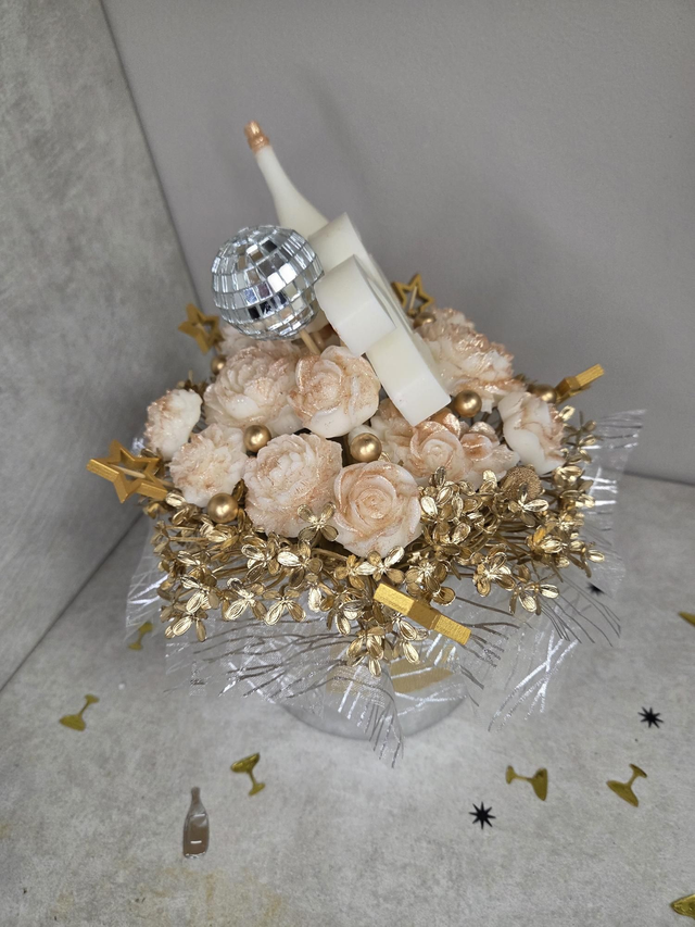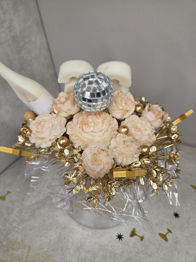 Un délicat ruban doré vient sublimer l’ensemble, apportant une touche chic et raffinée, parfaite pour le Nouvel An.