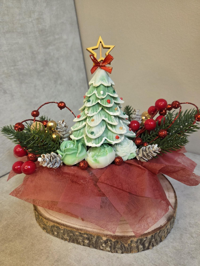 Laissez entrer la magie des fêtes avec ce joli bouquet fondant en forme de sapin vert. Entièrement coulé à la main, il pèse 130 g de cire parfumée et mesure environ 18 cm par 8 cm.