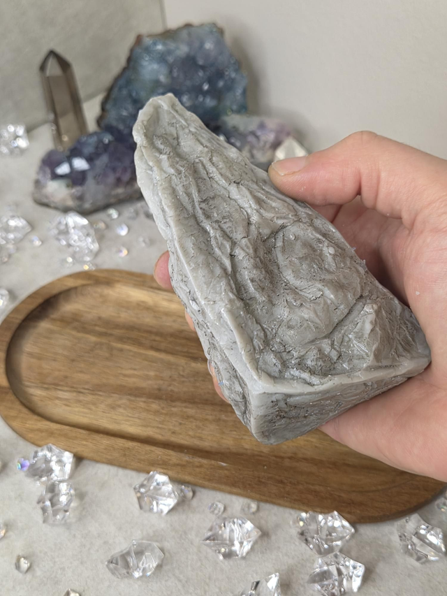 Bougie géode parfumée au musc et sculptée à la main. Sa forme grotte crée une illusion réaliste de géode naturelle : un relief cristallisé, lumineux et délicatement travaillé. Même sans être allumée, elle diffuse un parfum subtil qui parfume agréablement la pièce.
