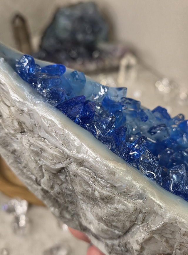 Chaque géode est façonnée, sculptée et colorée à la main.Les reliefs, la transparence et les nuances varient naturellement d’une pièce à l’autre.