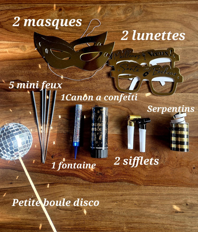 Utilisation : Décoration, ambiance parfumée, accessoire de fête 2 lunettes - 2 masques - 2 sifflets - 5 mini feux - 1 fontaine - serpentins - 1 canon à confetti