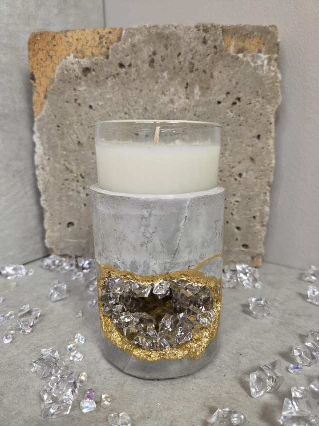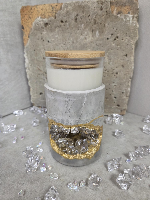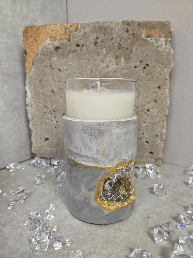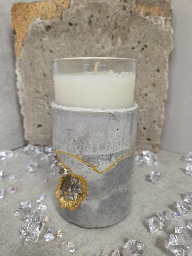 Ce photophore marie la force brute du béton et l’éclat du cristal. Sculpté et incrusté à la main, il diffuse une lumière douce tout en apportant une touche décorative et énergétique à votre intérieur.